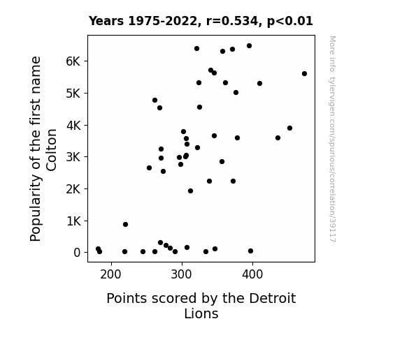 This means 28.5% of the change in the one variable (i.e., Points scored by the Detroit Lions) is predictable based on the change in the other (i.e., Popularity of the first name Colton) over the 48 years from 1975 through 2022.