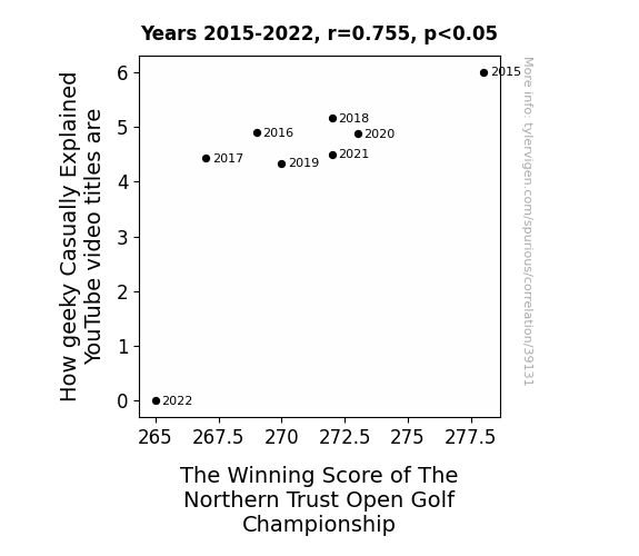 This means 57.1% of the change in the one variable (i.e., The Winning Score of The Northern Trust Open Golf Championship) is predictable based on the change in the other (i.e., How geeky Casually Explained YouTube video titles are) over the 8 years from 2015 through 2022.