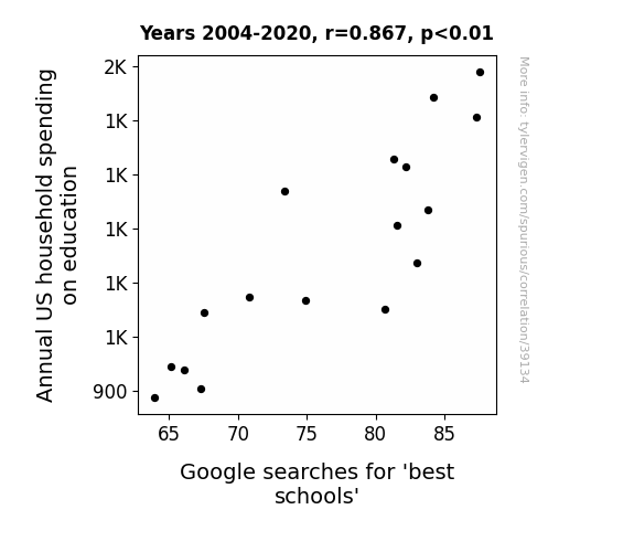 This means 75.1% of the change in the one variable (i.e., Google searches for 'best schools') is predictable based on the change in the other (i.e., Annual US household spending on education) over the 17 years from 2004 through 2020.