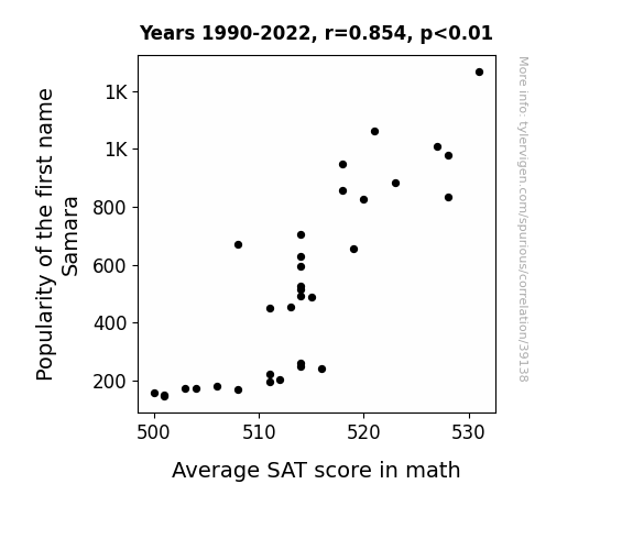 This means 72.9% of the change in the one variable (i.e., Average SAT score in math) is predictable based on the change in the other (i.e., Popularity of the first name Samara) over the 33 years from 1990 through 2022.