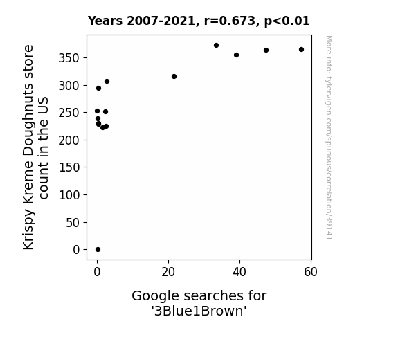 This means 45.3% of the change in the one variable (i.e., Google searches for '3Blue1Brown') is predictable based on the change in the other (i.e., Krispy Kreme Doughnuts store count in the US) over the 15 years from 2007 through 2021.
