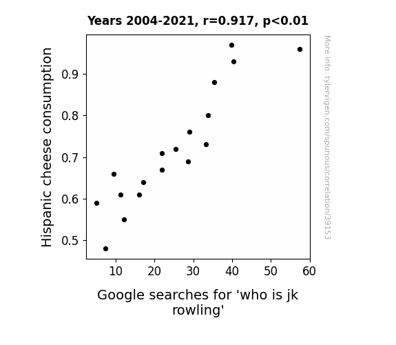 This means 84.1% of the change in the one variable (i.e., Google searches for 'who is jk rowling') is predictable based on the change in the other (i.e., Hispanic cheese consumption) over the 18 years from 2004 through 2021.