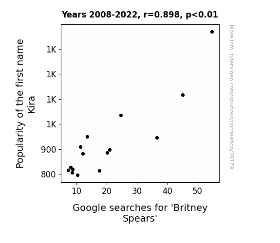This means 80.6% of the change in the one variable (i.e., Google searches for 'Britney Spears') is predictable based on the change in the other (i.e., Popularity of the first name Kira) over the 15 years from 2008 through 2022.