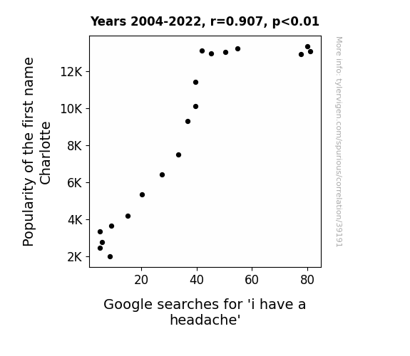 This means 82.2% of the change in the one variable (i.e., Google searches for 'i have a headache') is predictable based on the change in the other (i.e., Popularity of the first name Charlotte) over the 19 years from 2004 through 2022.