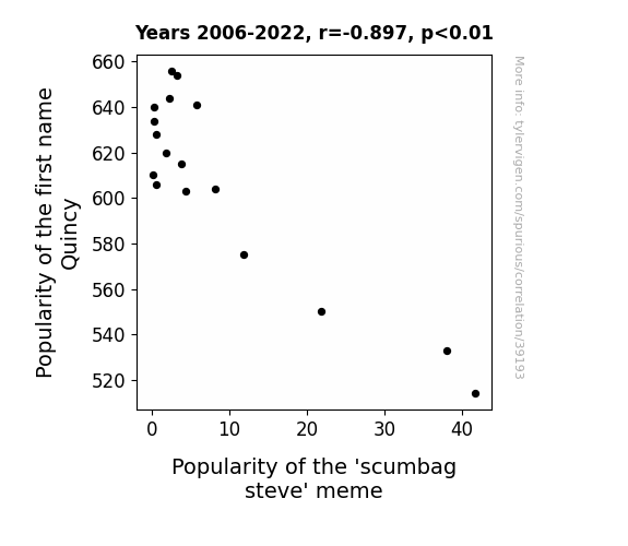 This means 80.4% of the change in the one variable (i.e., Popularity of the 'scumbag steve' meme) is predictable based on the change in the other (i.e., Popularity of the first name Quincy) over the 17 years from 2006 through 2022.
