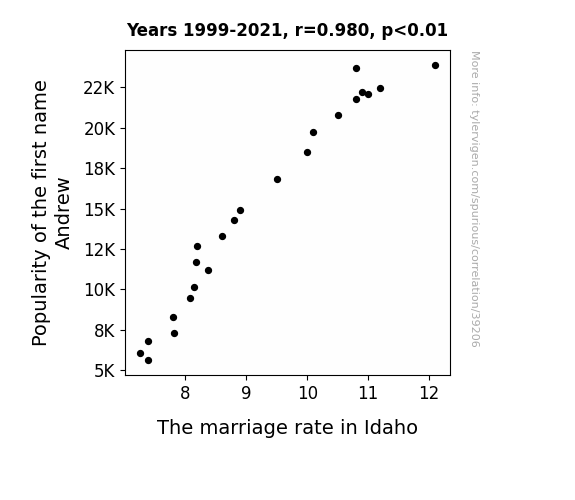 This means 96.1% of the change in the one variable (i.e., The marriage rate in Idaho) is predictable based on the change in the other (i.e., Popularity of the first name Andrew) over the 23 years from 1999 through 2021.