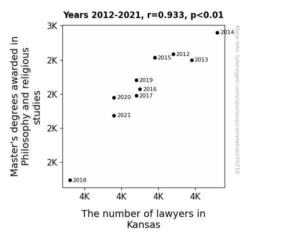 This means 87.1% of the change in the one variable (i.e., The number of lawyers in Kansas) is predictable based on the change in the other (i.e., Master's degrees awarded in Philosophy and religious studies) over the 10 years from 2012 through 2021.