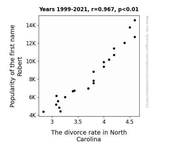 This means 93.5% of the change in the one variable (i.e., The divorce rate in North Carolina) is predictable based on the change in the other (i.e., Popularity of the first name Robert) over the 23 years from 1999 through 2021.