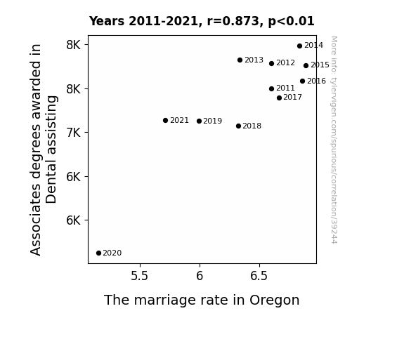This means 76.3% of the change in the one variable (i.e., The marriage rate in Oregon) is predictable based on the change in the other (i.e., Associates degrees awarded in Dental assisting) over the 11 years from 2011 through 2021.