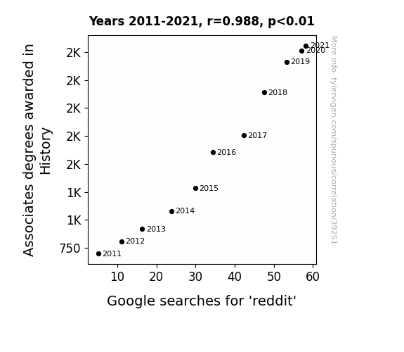 This means 97.6% of the change in the one variable (i.e., Google searches for 'reddit') is predictable based on the change in the other (i.e., Associates degrees awarded in History) over the 11 years from 2011 through 2021.