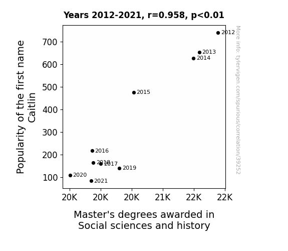 This means 91.8% of the change in the one variable (i.e., Master's degrees awarded in Social sciences and history) is predictable based on the change in the other (i.e., Popularity of the first name Caitlin) over the 10 years from 2012 through 2021.