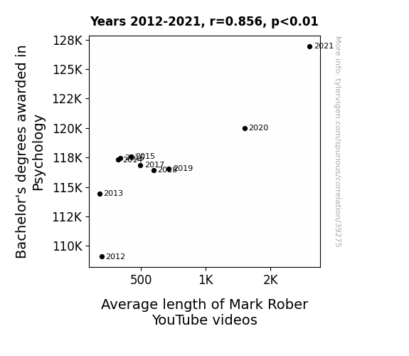 This means 73.3% of the change in the one variable (i.e., Average length of Mark Rober YouTube videos) is predictable based on the change in the other (i.e., Bachelor's degrees awarded in Psychology) over the 10 years from 2012 through 2021.