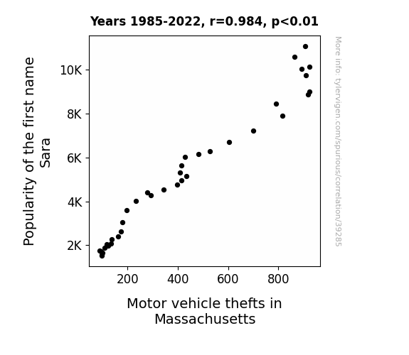 This means 96.8% of the change in the one variable (i.e., Motor vehicle thefts in Massachusetts) is predictable based on the change in the other (i.e., Popularity of the first name Sara) over the 38 years from 1985 through 2022.