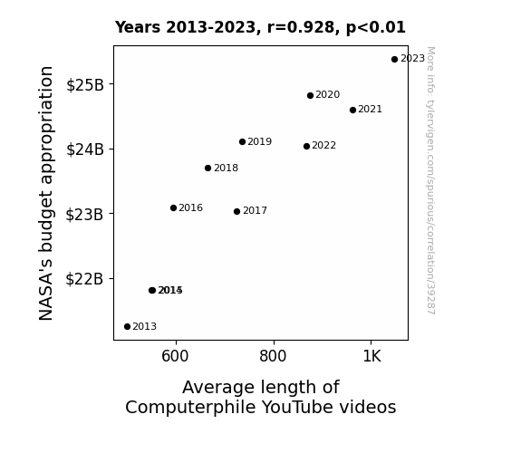 This means 86.1% of the change in the one variable (i.e., Average length of Computerphile YouTube videos) is predictable based on the change in the other (i.e., NASA's budget appropriation) over the 11 years from 2013 through 2023.
