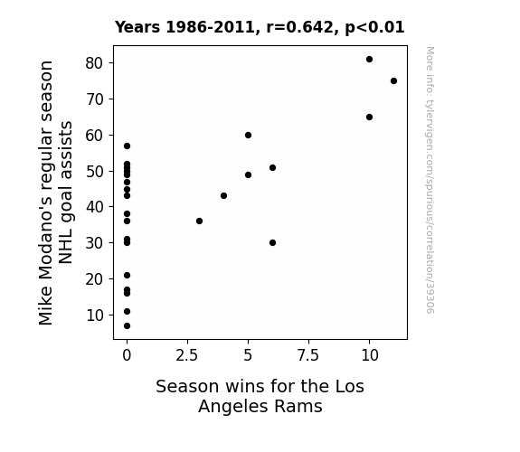 This means 41.2% of the change in the one variable (i.e., Season wins for the Los Angeles Rams) is predictable based on the change in the other (i.e., Mike Modano's regular season NHL goal assists) over the 26 years from 1986 through 2011.
