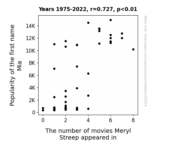 This means 52.9% of the change in the one variable (i.e., The number of movies Meryl Streep appeared in) is predictable based on the change in the other (i.e., Popularity of the first name Mia) over the 48 years from 1975 through 2022.