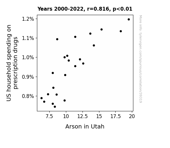 This means 66.6% of the change in the one variable (i.e., Arson in Utah) is predictable based on the change in the other (i.e., US household spending on prescription drugs) over the 23 years from 2000 through 2022.