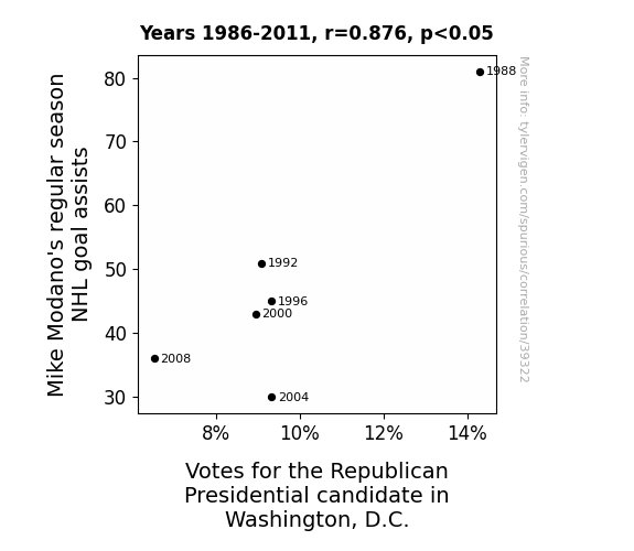 This means 76.7% of the change in the one variable (i.e., Votes for the Republican Presidential candidate in Washington, D.C.) is predictable based on the change in the other (i.e., Mike Modano's regular season NHL goal assists) over the 6 years from 1986 through 2011.
