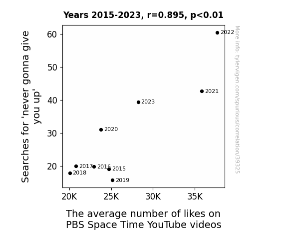 This means 80.2% of the change in the one variable (i.e., The average number of likes on PBS Space Time YouTube videos) is predictable based on the change in the other (i.e., Searches for 'never gonna give you up') over the 9 years from 2015 through 2023.
