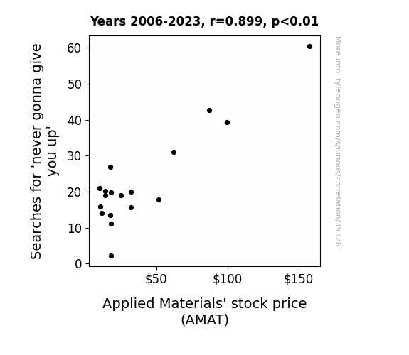 This means 80.9% of the change in the one variable (i.e., Applied Materials' stock price (AMAT)) is predictable based on the change in the other (i.e., Searches for 'never gonna give you up') over the 18 years from 2006 through 2023.