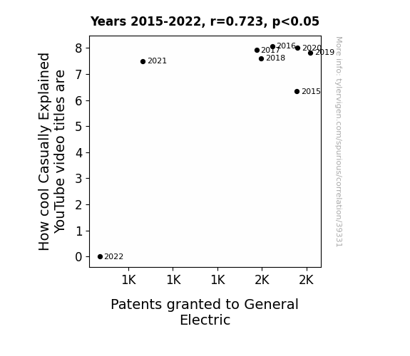 This means 52.2% of the change in the one variable (i.e., Patents granted to General Electric) is predictable based on the change in the other (i.e., How cool Casually Explained YouTube video titles are) over the 8 years from 2015 through 2022.
