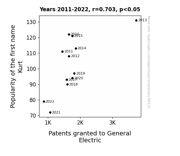 This means 49.4% of the change in the one variable (i.e., Patents granted to General Electric) is predictable based on the change in the other (i.e., Popularity of the first name Kurt) over the 12 years from 2011 through 2022.