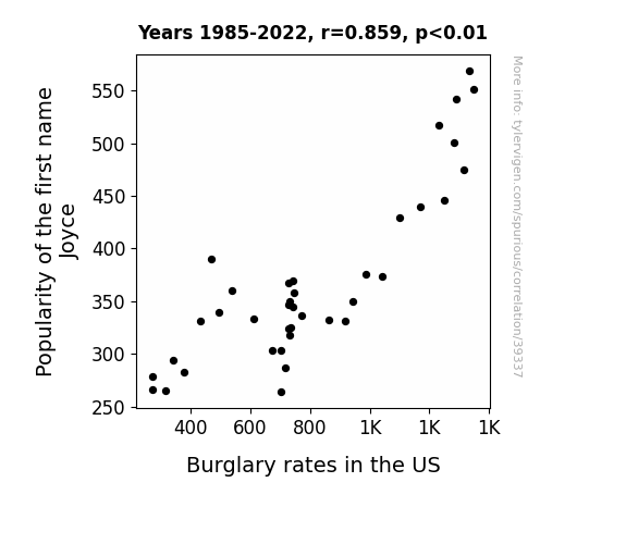 This means 73.8% of the change in the one variable (i.e., Burglary rates in the US) is predictable based on the change in the other (i.e., Popularity of the first name Joyce) over the 38 years from 1985 through 2022.