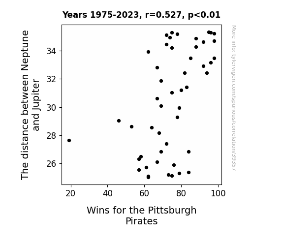 This means 27.8% of the change in the one variable (i.e., Wins for the Pittsburgh Pirates) is predictable based on the change in the other (i.e., The distance between Neptune and Jupiter) over the 49 years from 1975 through 2023.