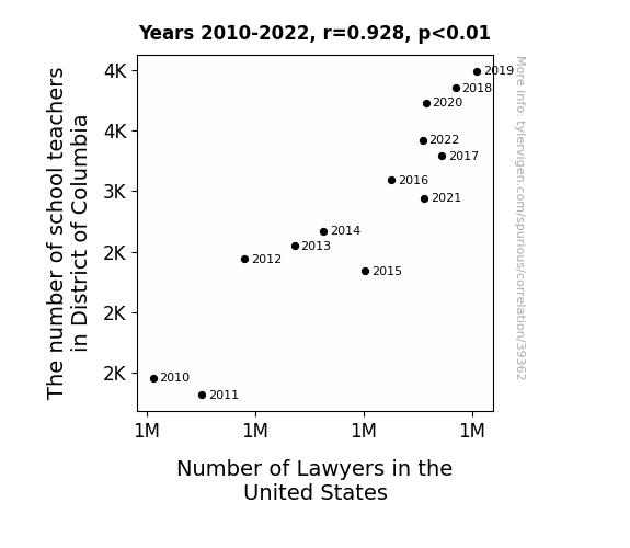 This means 86.2% of the change in the one variable (i.e., Number of Lawyers in the United States) is predictable based on the change in the other (i.e., The number of school teachers in District of Columbia) over the 13 years from 2010 through 2022.