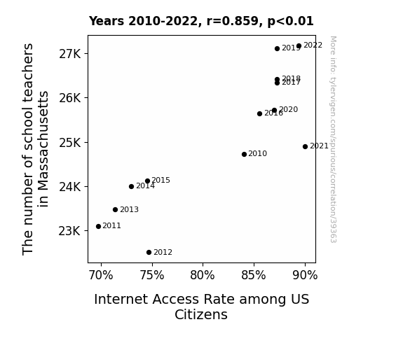 This means 73.8% of the change in the one variable (i.e., Internet Access Rate among US Citizens) is predictable based on the change in the other (i.e., The number of school teachers in Massachusetts) over the 13 years from 2010 through 2022.