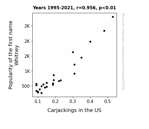 This means 91.5% of the change in the one variable (i.e., Carjackings in the US) is predictable based on the change in the other (i.e., Popularity of the first name Whitney) over the 27 years from 1995 through 2021.