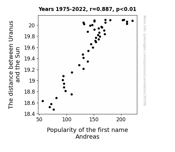 This means 78.7% of the change in the one variable (i.e., Popularity of the first name Andreas) is predictable based on the change in the other (i.e., The distance between Uranus and the Sun) over the 48 years from 1975 through 2022.