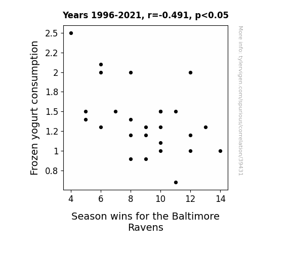 This means 24.1% of the change in the one variable (i.e., Season wins for the Baltimore Ravens) is predictable based on the change in the other (i.e., Frozen yogurt consumption) over the 26 years from 1996 through 2021.