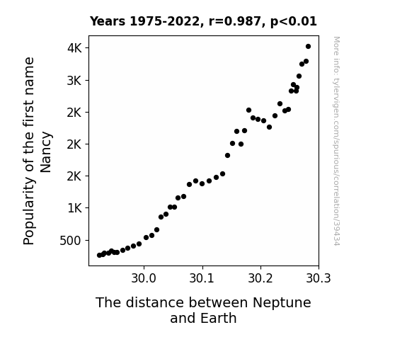 This means 97.4% of the change in the one variable (i.e., The distance between Neptune and Earth) is predictable based on the change in the other (i.e., Popularity of the first name Nancy) over the 48 years from 1975 through 2022.