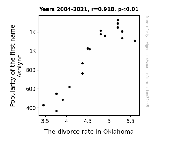 This means 84.2% of the change in the one variable (i.e., The divorce rate in Oklahoma) is predictable based on the change in the other (i.e., Popularity of the first name Ashlynn) over the 18 years from 2004 through 2021.