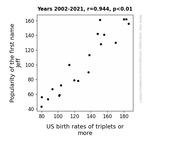 This means 89.1% of the change in the one variable (i.e., US birth rates of triplets or more) is predictable based on the change in the other (i.e., Popularity of the first name Jeff) over the 20 years from 2002 through 2021.