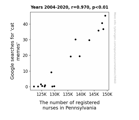 This means 94% of the change in the one variable (i.e., The number of registered nurses in Pennsylvania) is predictable based on the change in the other (i.e., Google searches for 'cat memes') over the 17 years from 2004 through 2020.