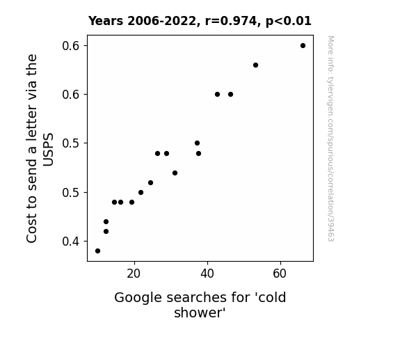 This means 94.9% of the change in the one variable (i.e., Google searches for 'cold shower') is predictable based on the change in the other (i.e., Cost to send a letter via the USPS) over the 17 years from 2006 through 2022.