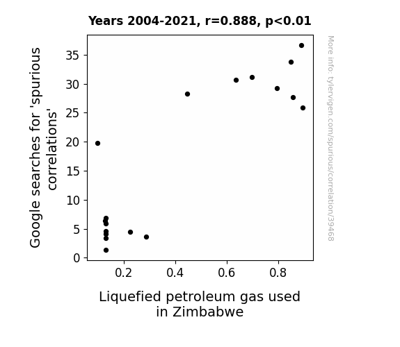 This means 78.9% of the change in the one variable (i.e., Liquefied petroleum gas used in Zimbabwe) is predictable based on the change in the other (i.e., Google searches for 'spurious correlations') over the 18 years from 2004 through 2021.