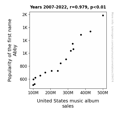 This means 95.8% of the change in the one variable (i.e., United States music album sales) is predictable based on the change in the other (i.e., Popularity of the first name Abby) over the 16 years from 2007 through 2022.