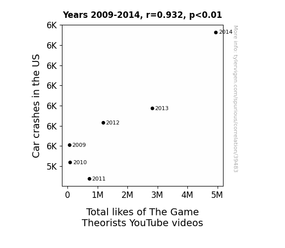 This means 86.9% of the change in the one variable (i.e., Total likes of The Game Theorists YouTube videos) is predictable based on the change in the other (i.e., Car crashes in the US) over the 6 years from 2009 through 2014.