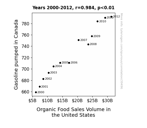 This means 96.8% of the change in the one variable (i.e., Organic Food Sales Volume in the United States) is predictable based on the change in the other (i.e., Gasoline pumped in Canada) over the 13 years from 2000 through 2012.