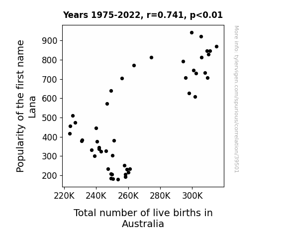 This means 54.9% of the change in the one variable (i.e., Total number of live births in Australia) is predictable based on the change in the other (i.e., Popularity of the first name Lana) over the 48 years from 1975 through 2022.