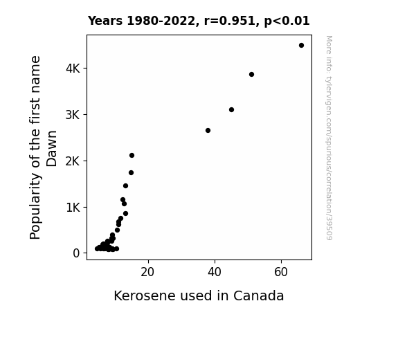 This means 90.5% of the change in the one variable (i.e., Kerosene used in Canada) is predictable based on the change in the other (i.e., Popularity of the first name Dawn) over the 43 years from 1980 through 2022.
