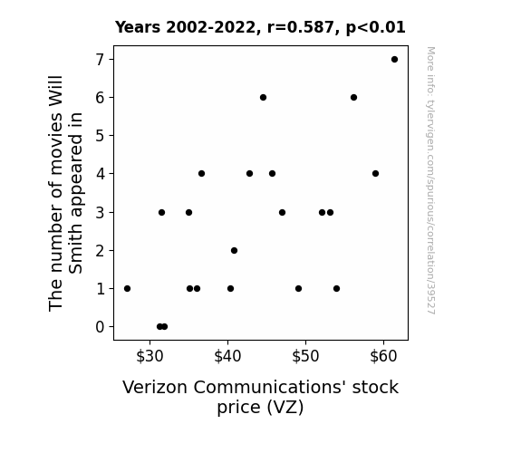 This means 34.4% of the change in the one variable (i.e., Verizon Communications' stock price (VZ)) is predictable based on the change in the other (i.e., The number of movies Will Smith appeared in) over the 21 years from 2002 through 2022.