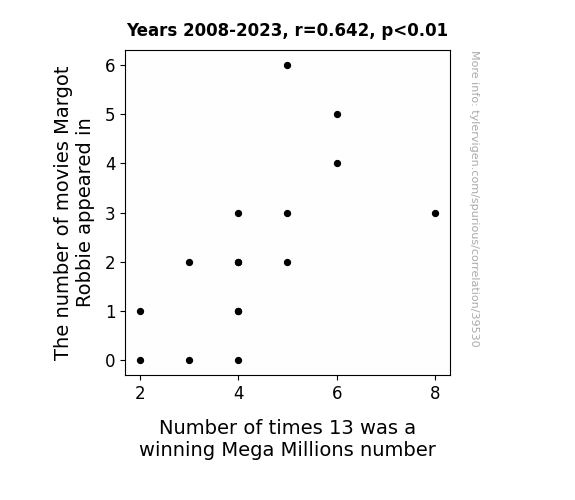 This means 41.3% of the change in the one variable (i.e., Number of times 13 was a winning Mega Millions number) is predictable based on the change in the other (i.e., The number of movies Margot Robbie appeared in) over the 16 years from 2008 through 2023.