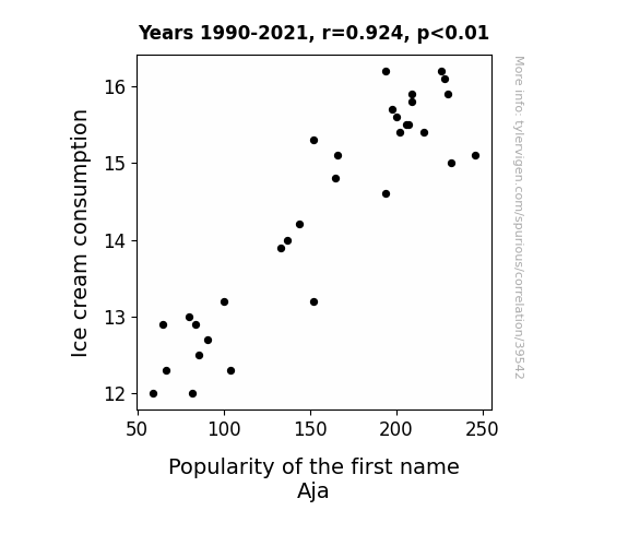 This means 85.3% of the change in the one variable (i.e., Popularity of the first name Aja) is predictable based on the change in the other (i.e., Ice cream consumption) over the 32 years from 1990 through 2021.