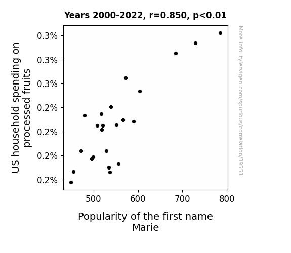 This means 72.3% of the change in the one variable (i.e., Popularity of the first name Marie) is predictable based on the change in the other (i.e., US household spending on processed fruits) over the 23 years from 2000 through 2022.