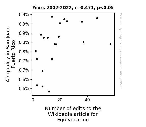 This means 22.2% of the change in the one variable (i.e., Number of edits to the Wikipedia article for Equivocation) is predictable based on the change in the other (i.e., Air quality in San Juan, Puerto Rico) over the 21 years from 2002 through 2022.