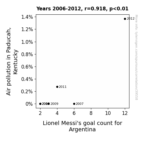 This means 84.3% of the change in the one variable (i.e., Lionel Messi's goal count for Argentina) is predictable based on the change in the other (i.e., Air pollution in Paducah, Kentucky) over the 7 years from 2006 through 2012.